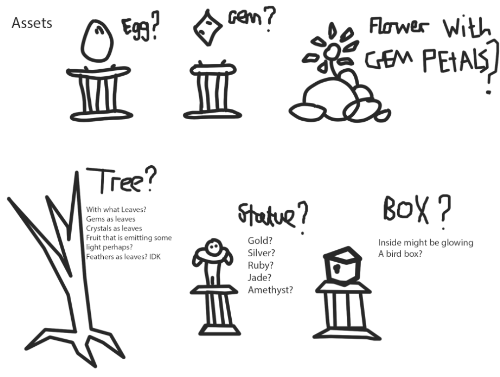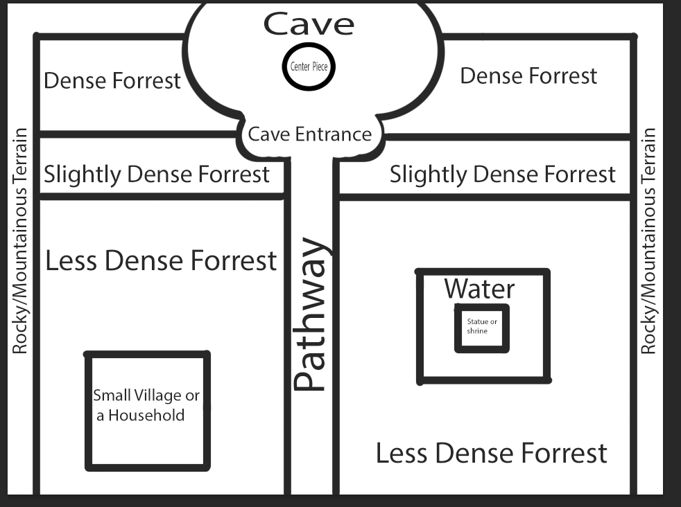 I have designed a very basic bird’s eye view of the map idea of my environment. I planned to create a fairly large landscape with a forest that gets denser the more you venture through. Within the forest, I had ideas of placing a small village on the left and a statue or shrine on the right. In the middle of the landscape there is a pathway leading to a cave entrance that leads to a massive area in the cave. Surrounding the forest, I’m planning to create a rocky mountain terrain.