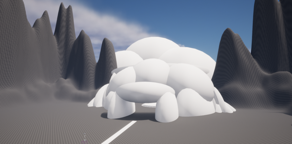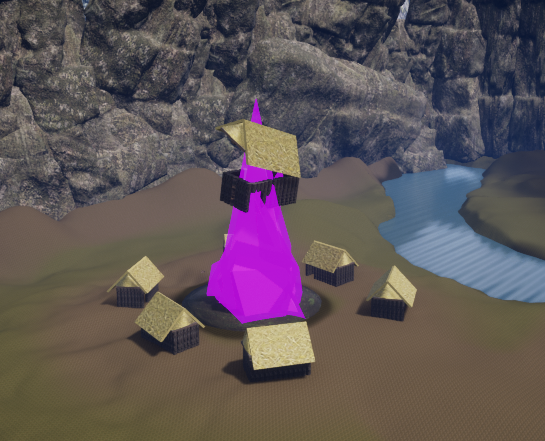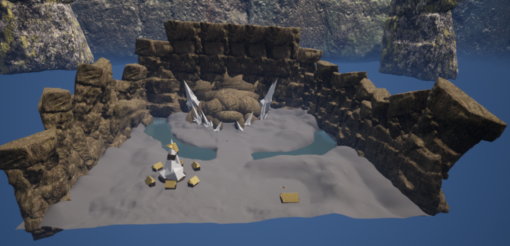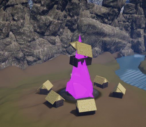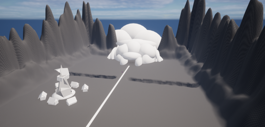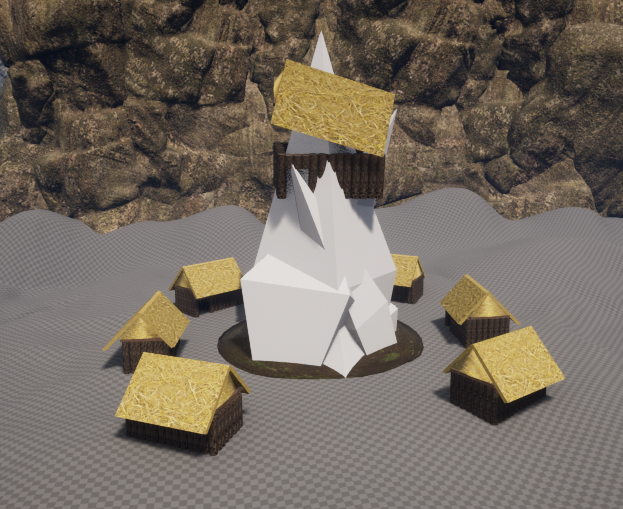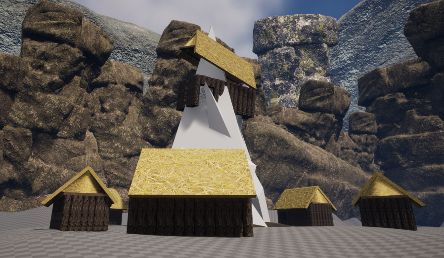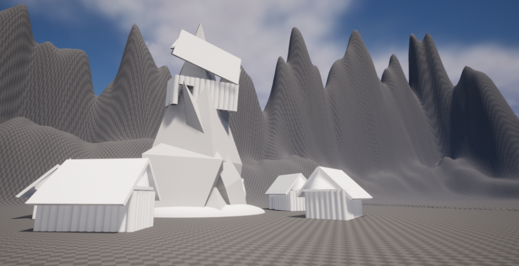 These images are a Work in Progress of my environment design. I have created a terrain with a rocky mountain edge and I’m planning to create a forest-like area with a cave containing my centre piece. Every now and again, I will be adding new content and updating my environment. I have added a small village with a giant spike jutting from the ground as a key environment piece.