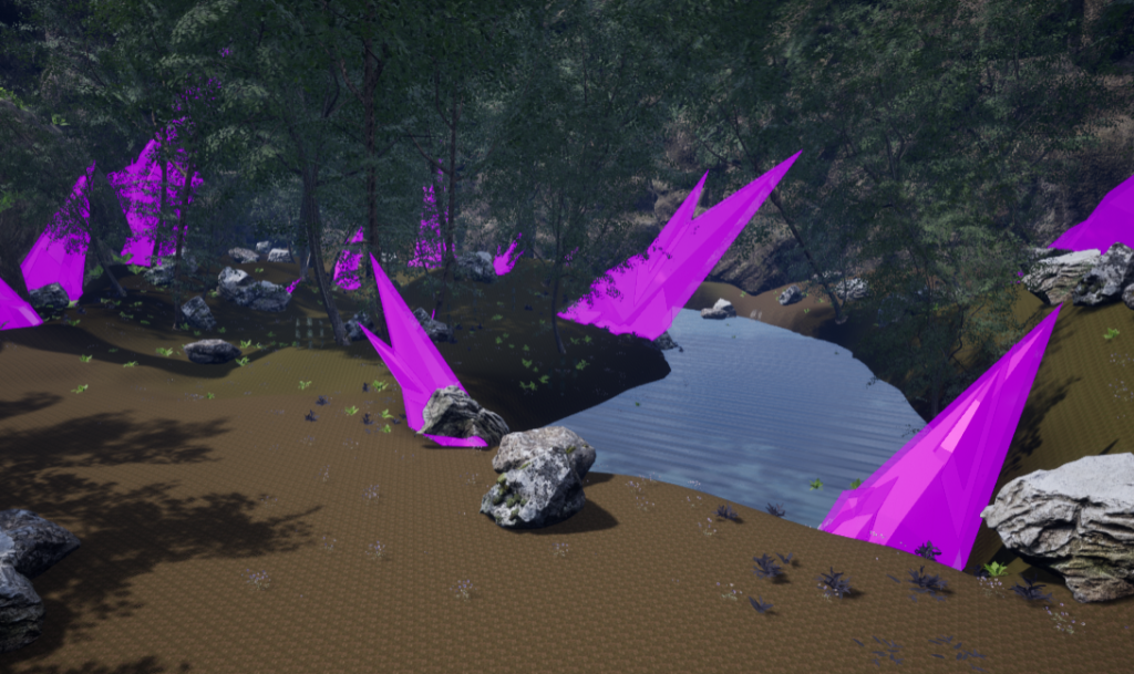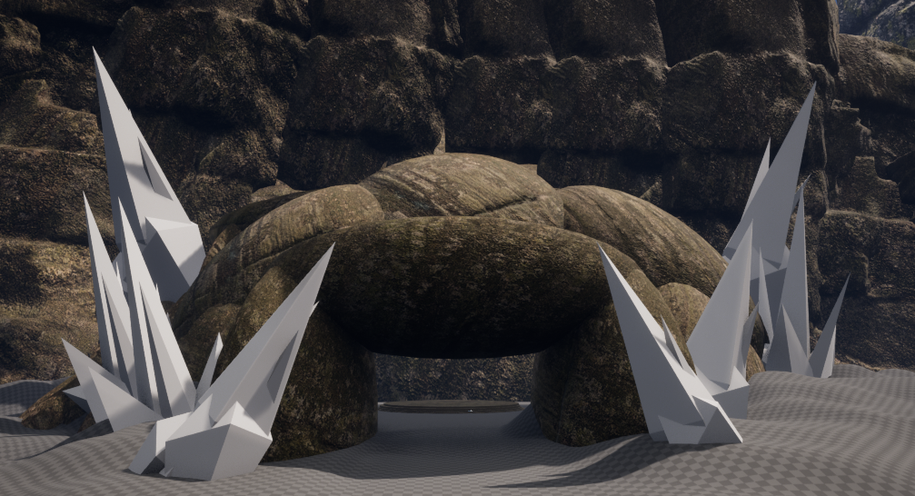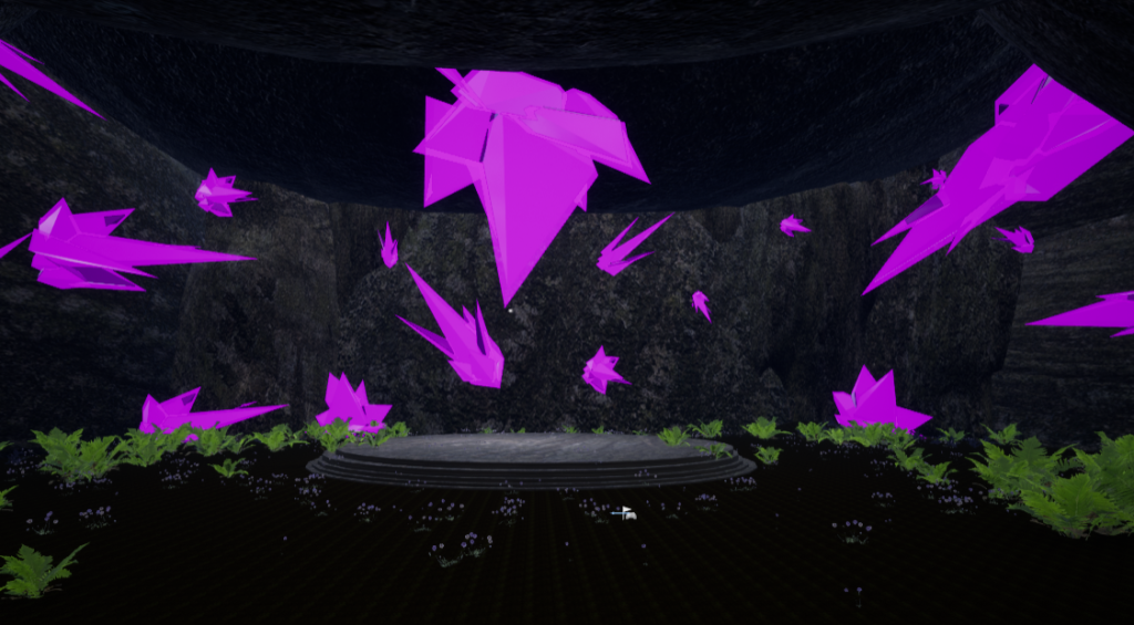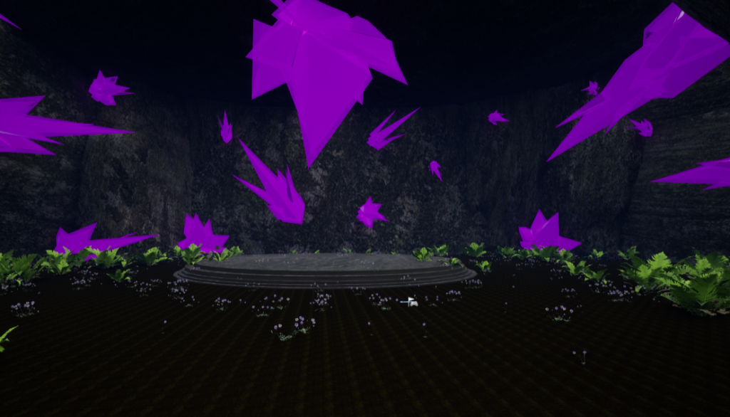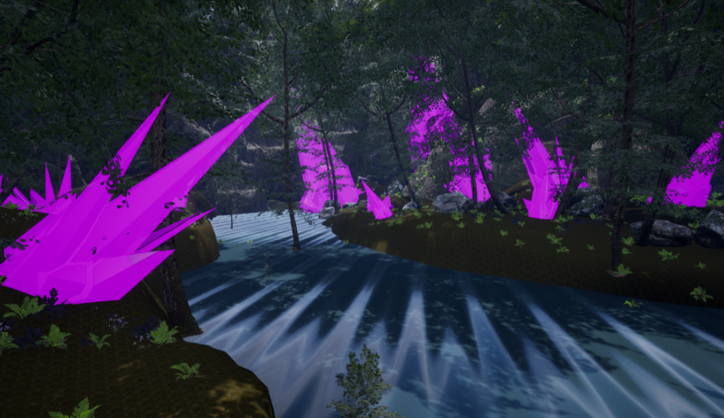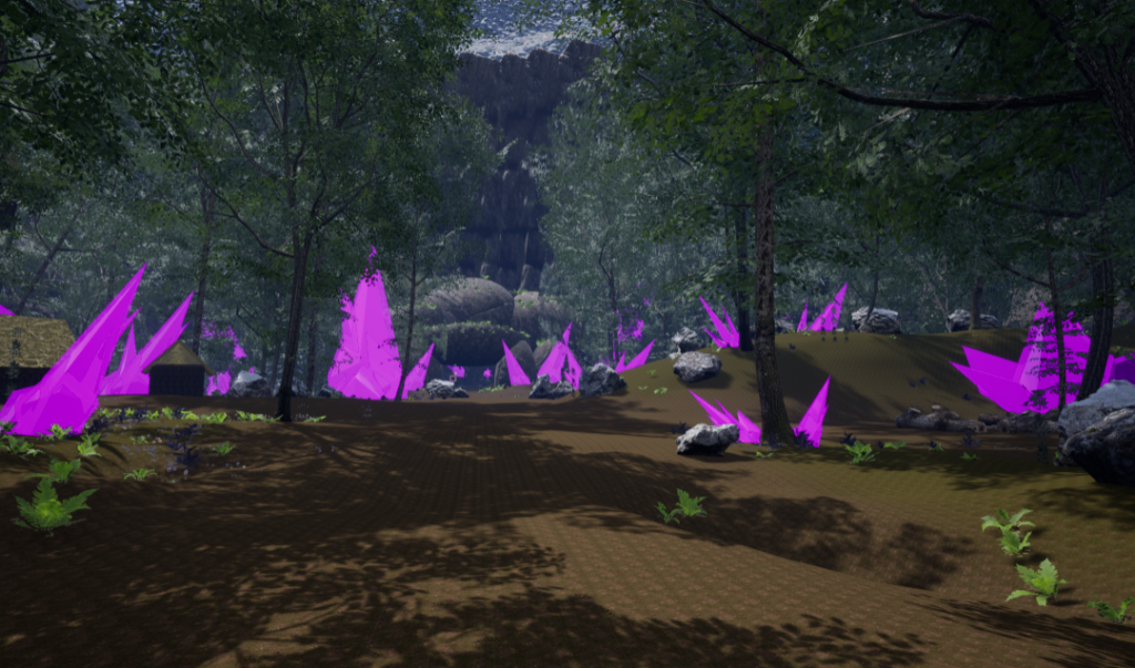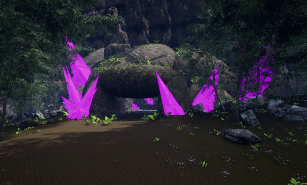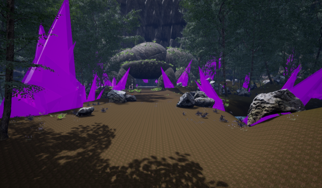 When it comes to creating my 3D environment, I wanted crystals jutting spikes out of the ground at some surfaces and corners of the map and create a forest area that gets denser and denser the more you follow the path towards the cave.