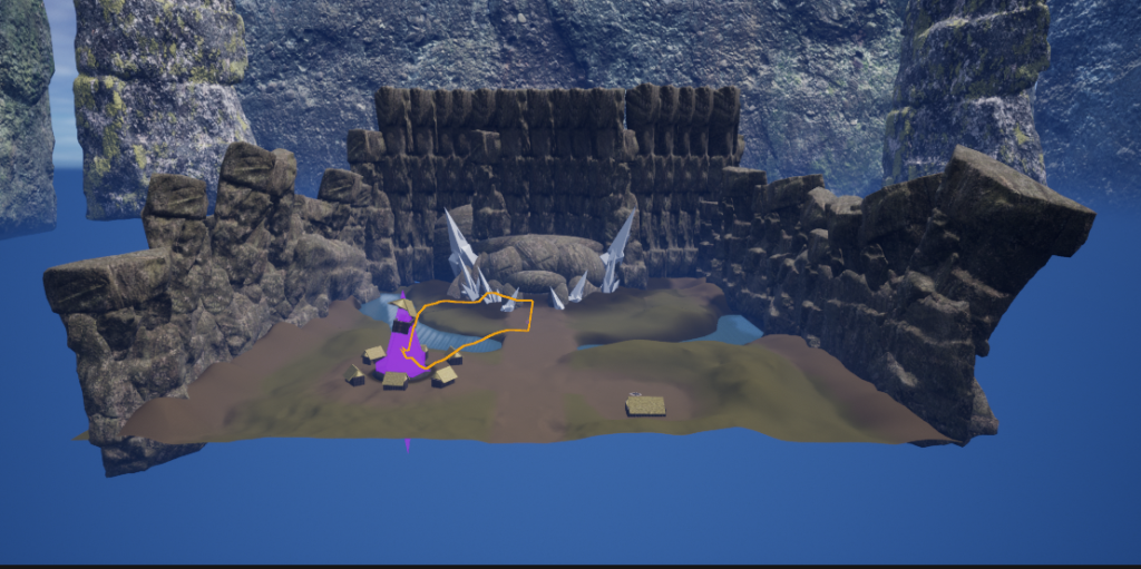 By randomly placing glowing crystals in the environment, I have achieved the corrupted area I was aiming for when planed my environment design using inspiration and photoshop to map out stuff at a bird’s eye view.
