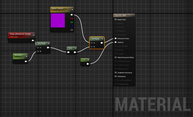 After I was done with the landscape, (connecting boxes using the the visual coding function of unreal) I moved onto making another texture which was making a glowing crystal material for the crystals I have jutting around on the map. I wanted the material to be slightly see through and glow with a heartbeat effect meaning it will dim every now and again. I have asked a bunch of students on the Game Design course if they knew how to create a material that can glow with a heartbeat. I received some help from others and created a material blueprint that looks like this: