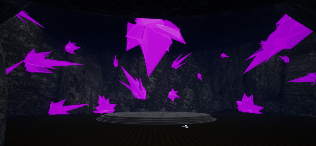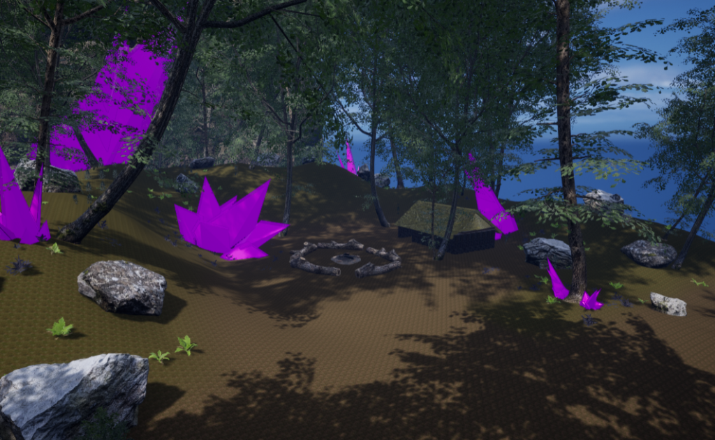 This image shows a base of what I have created within the environment. I have learned that making a shard shapes out of cubes are a bit finicky because you need to move the vertices of the shape to create this sharp look. I am planning to create clusters of these around the environment, near most trees, in caves and and other spaces. Also creating different cluster variants meaning there is a small version a longer version.