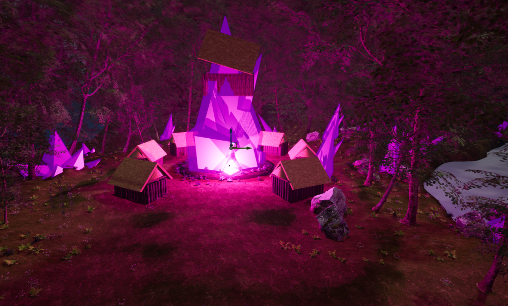 I believe I have created a narrative in my environment design. The forest was a calm and peaceful place with the village residents living, working and having a nice time. Until a giant crystal spike juts out of the ground impaling the communal building.