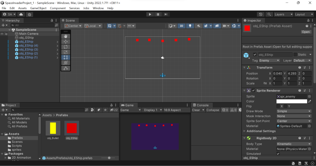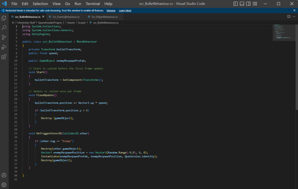 I have successfully given my player character a customised spaceship and have assigned the sprite onto the the player and it was successful. The enemies however, is harder to implement the sprite because when the player shoots them, the image reverts back to it’s original size when it was implemented. Secondly, I tried to make the enemy ships respawn when they hit a certain co-ordinate on the y-axis by creating the same line of code from scratch using inspiration from the bullet behaviour script where it destroys the bullet when it reaches at a certain co-ordinate on the y-axis. But that didn’t work. I plan to solve these issues by showing my lectures the issue and go through with them on completing the game and putting it on Itch.io.