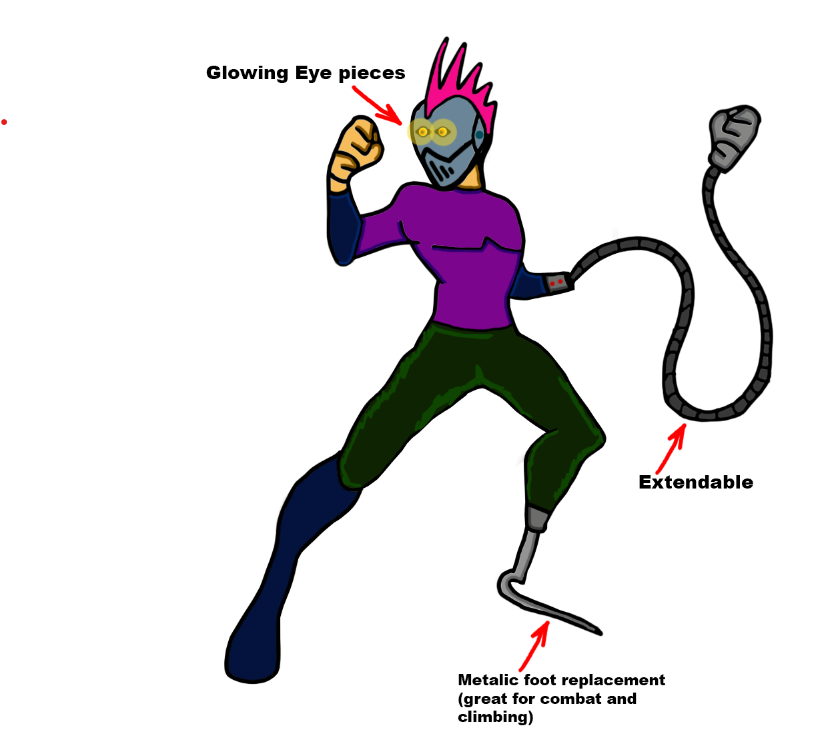 I wanted to create spice within the style of my character. For example, I added a mask with glowing eyes, extendable arms and a prosthetic leg made out of stain-less steel (This character likes Mortal Kombat so he made himself fit with the world he lives in).