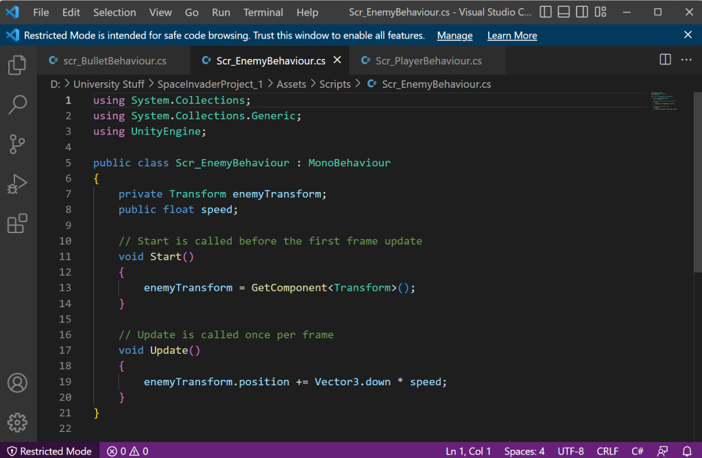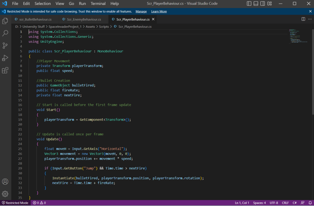 Those videos above helped me understand the process of creating the space invader game and surprisingly, I managed to make a fully functional game with little problems. The videos taught me how to make create behaviours for the player, enemy and the bullet. I used scripts to create the mechanics of the game. I made a Player behaviour script, an Enemy behaviour script and a Bullet behaviour script. Using a bit of my knowledge from the cookie clicker game, I felt more confident in making the space invaders game. Also with the help of the videos shown to me I was able to create the scripts with ease.
