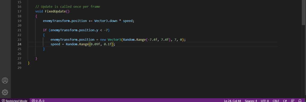 Implementing the image onto the enemy prefabs was an easy process. I drag the image into the sprite and change the size in the prefab transform scale tool. Also when it spawns, it stays the same size after I shoot it. I also added a function within the Enemy behaviour script and written a line of script so that every time the enemy reaches at a certain point on the y-axis the enemy respawns above the screen at a certain y-axis. This is what the code new line looks like: