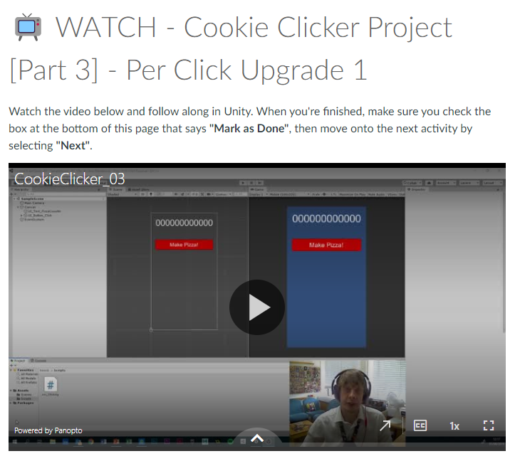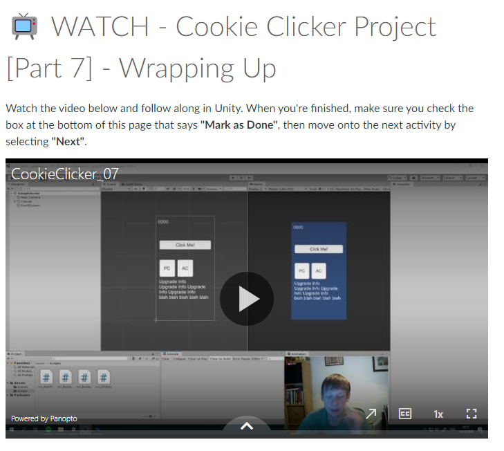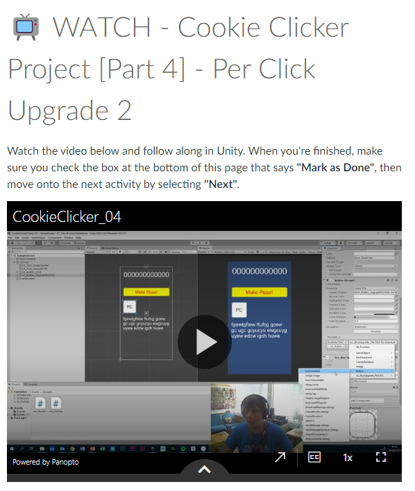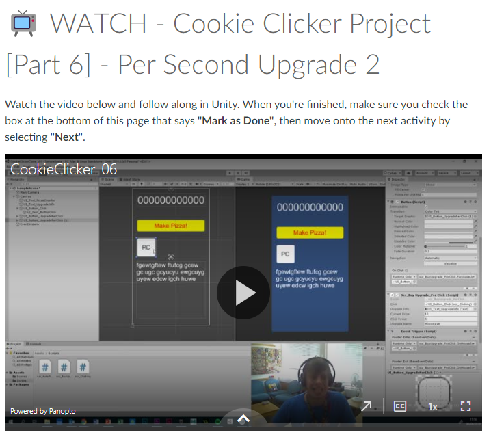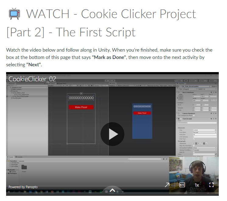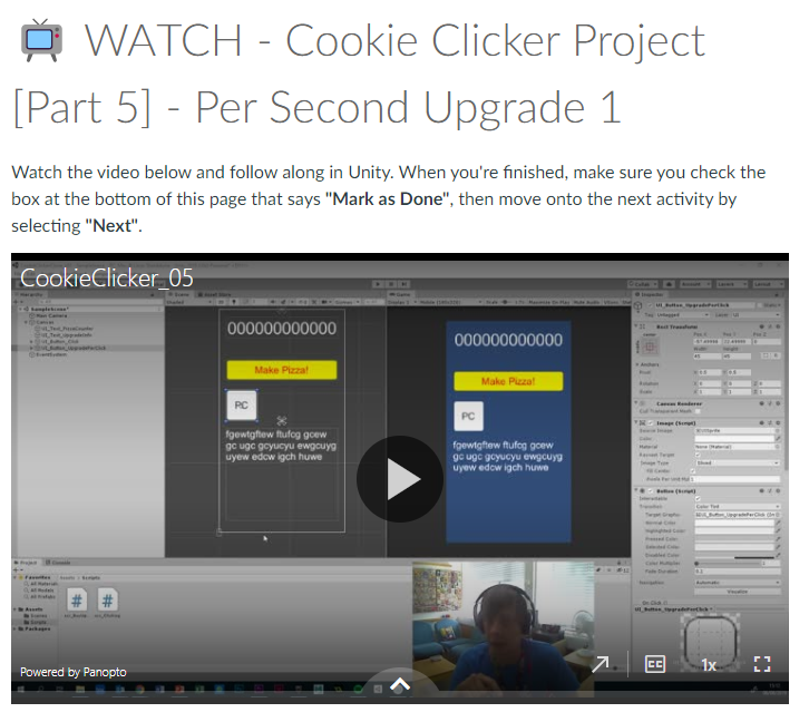 Those videos helped me understand and familiarise the functions, scripture and the software itself. The contents of those videos include the introduction, UI Setup, Scripting, Function linking and finalising for release. During this period, I have learned how to use unity to create an interactable UI using scripts guided to me using the videos. I have learned how to add components to the buttons I need to make this cookie clicker game and have learned how to use scripting within unity by following the video to the point. I also learned that scripting is very strict meaning a single character out of place or missing, the entire script wont work.