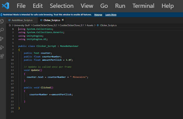 I managed to create a working main button for the clicker game and have added a counter to show how many Minecoins the player has. I made so that every time you click the main button, the counter goes up every click with the help of scripts. Furthermore, I have created more buttons categorised as upgrade buttons. I have followed and took close attention to the video tutorial that talks about coding and creating the scripts for the upgrade buttons. Overall I have made two different (named PC and AC) buttons one allows you to purchase to gain more when you click on the main button and the second button allows you to purchase a miner that adds 1 Minecoin every second automatically.